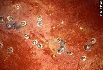 de cerca de 2mm de diâmetro de coloração violácea escura com centro e